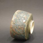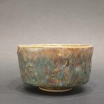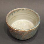 Hand thrown textured teabowl, glazed with light blue glaze with peacock blue glaze overlay with various tones. Signed on base. Fired to 1200 degrees C. Food safe and hand wash preferably.